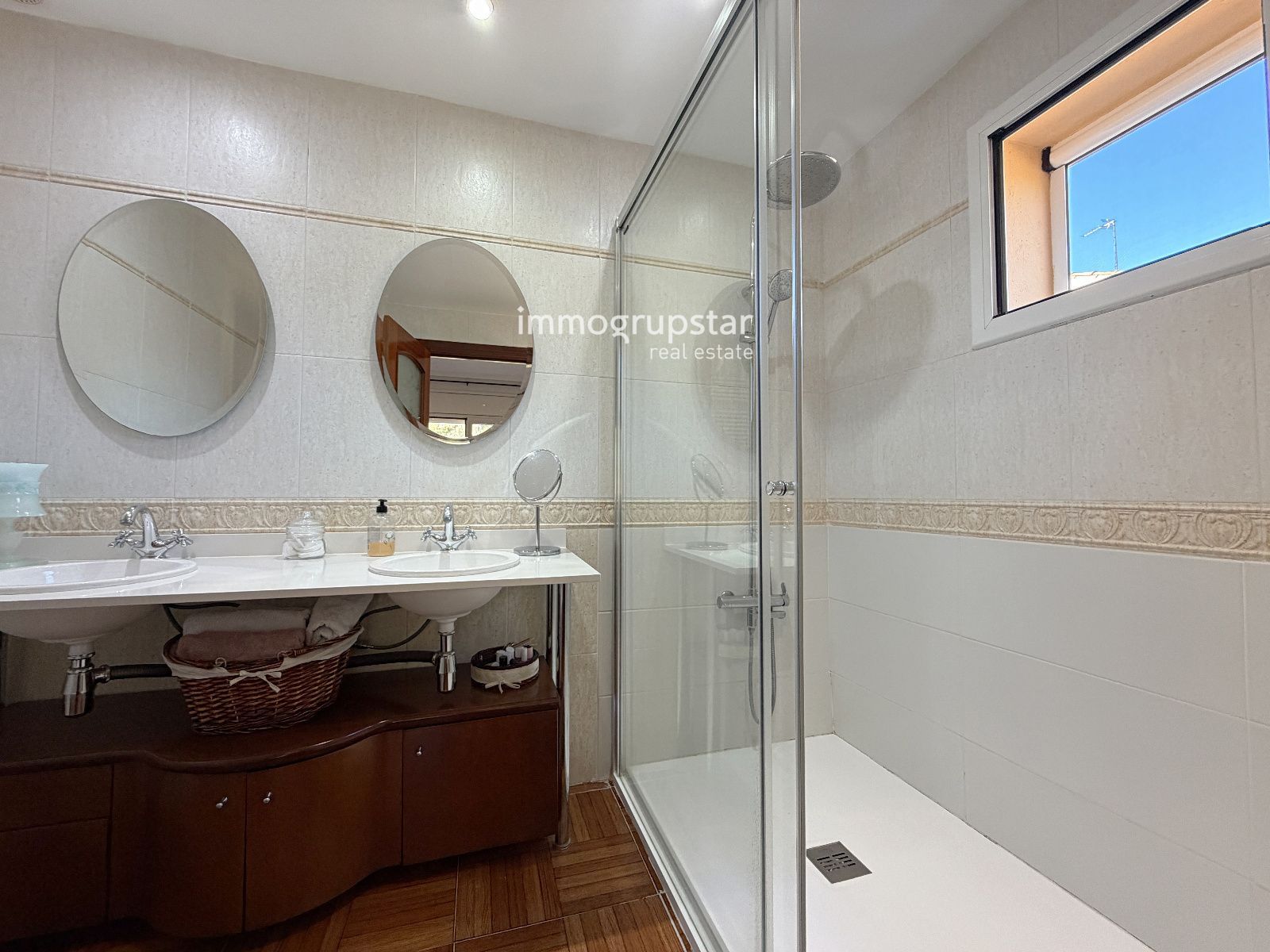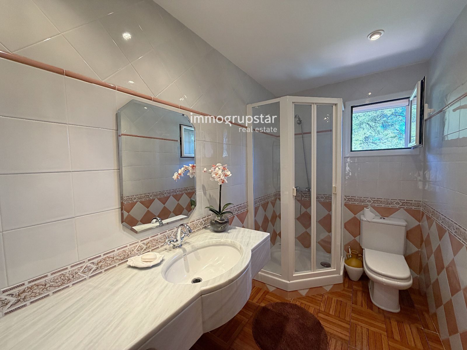 A la planta baixa trobem un saló-menjador lluminós amb sortida directa al jardí, una cuina independent d’estil clàssic, una suite amb bany privat, una segona cuina de disseny modern, un menjador amb llar de foc i un lavabo de cortesia. Els terres de gres porcellànic aporten durabilitat, confort i una estètica elegant a tota la planta.