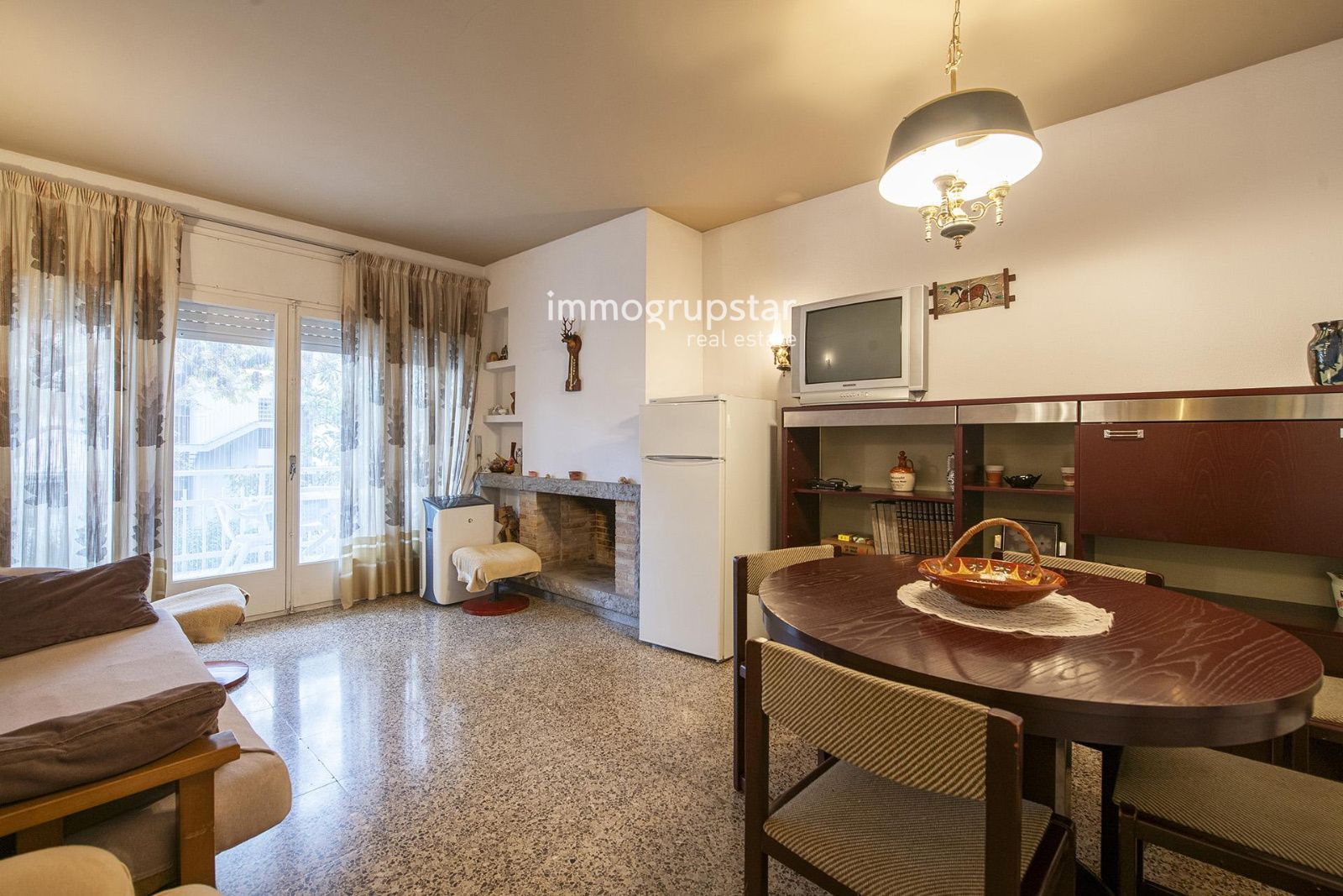 Este apartamento, situado en una zona tranquila de Platja d'Aro, dispone de una sala de estar-comedor con chimenea y salida a la terraza, cocina polivalente también con salida a la terraza, tres habitaciones —dos de ellas dobles y una individual— y un baño completo con plato de ducha.