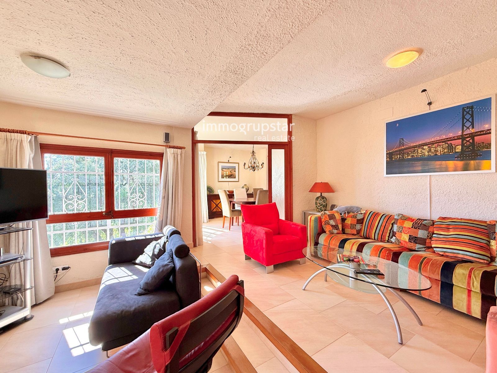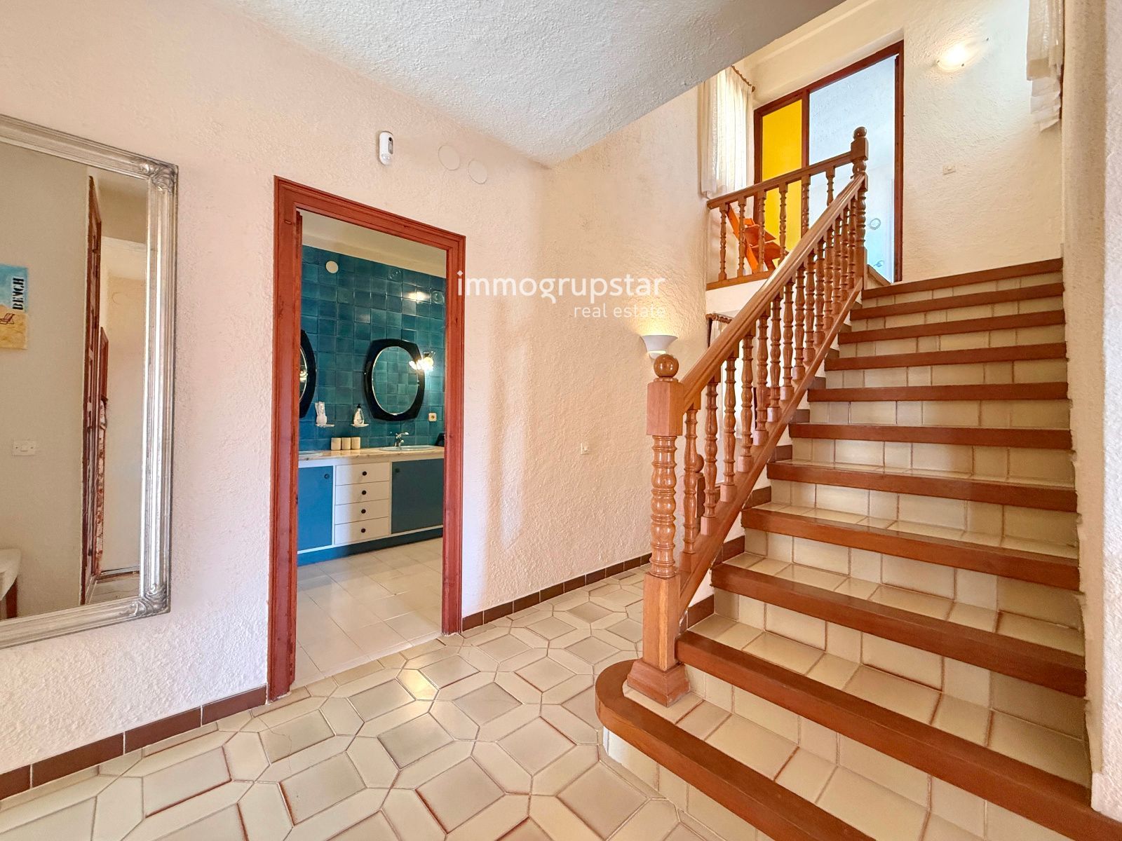 La villa está distribuida en varios niveles, combinando confort con carácter. La cocina cerrada está completamente equipada y conecta con el comedor, que a su vez se integra con el amplio salón. Este dispone de varias zonas de estar, una acogedora chimenea y acceso directo a la espaciosa terraza parcialmente cubierta con vistas panorámicas.