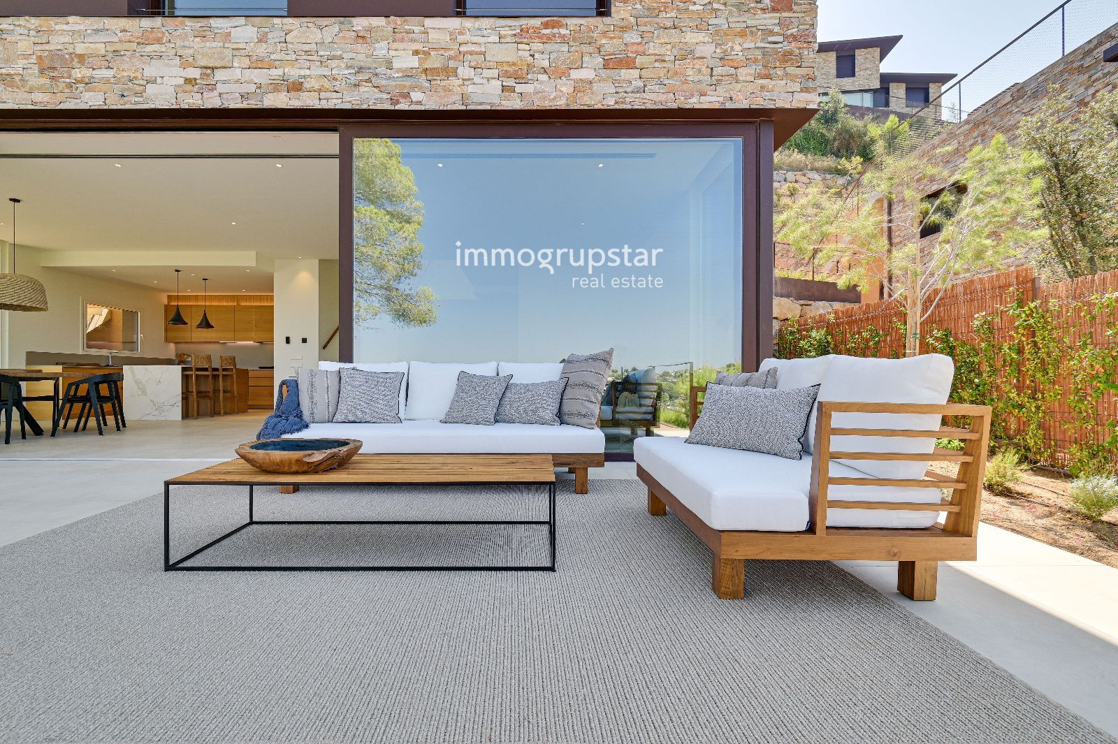 Интерьер представляет собой визуальное зрелище с использованием высококачественных натуральных материалов. Паркетный пол с деревянными плинтусами и напольная плитка из керамогранита гармонично сочетаются, а ванные комнаты элегантно облицованы плиткой. Во внешнем фасаде сочетаются натуральный камень и штукатурка, что придает ему уникальный и изысканный характер. Внешние алюминиевые двери и окна с двойным остеклением обеспечивают энергоэффективность и комфорт.